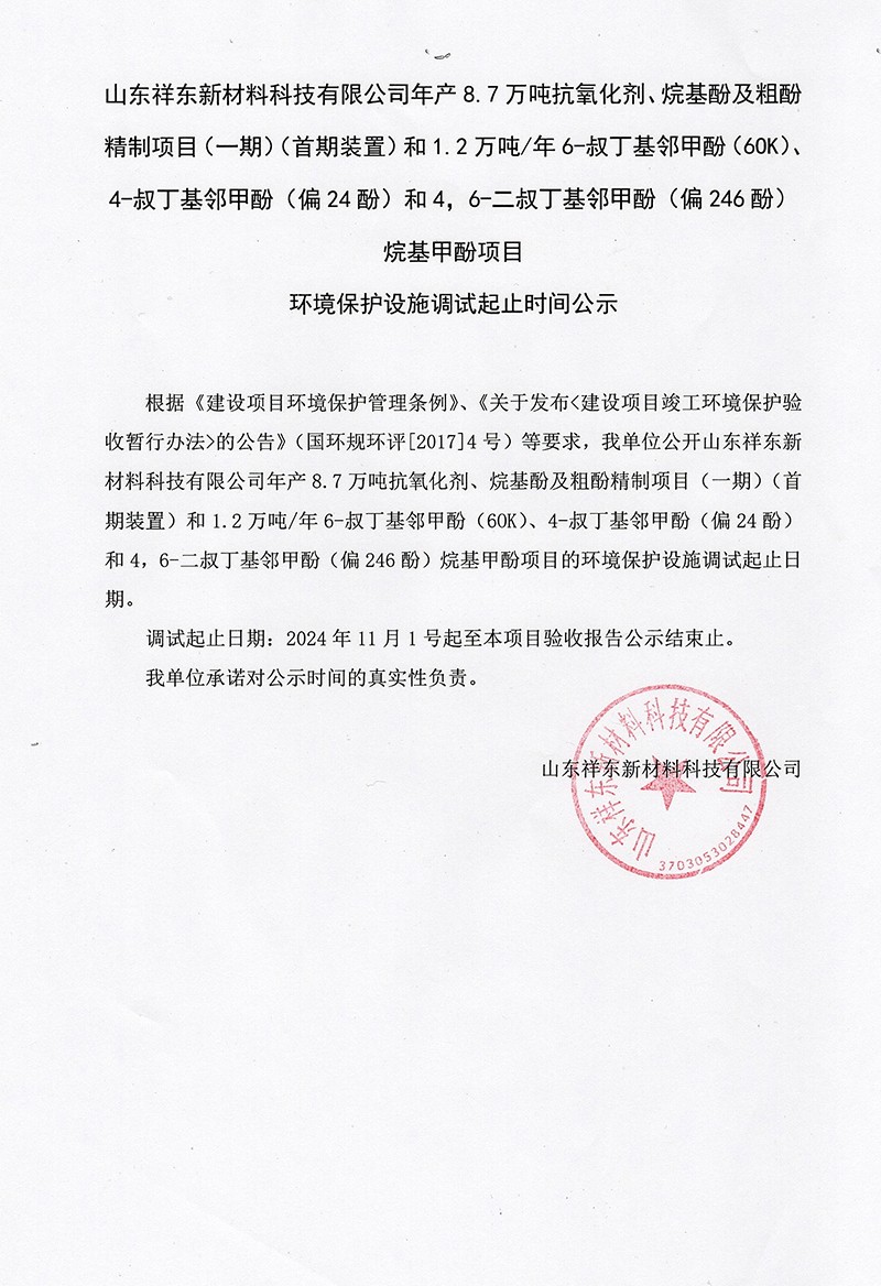 山東祥東新材料科技有限公司1.2萬噸/年6-叔丁基鄰甲(60K)、4-叔丁基鄰甲酚(偏 24 酚)和 4,6-二叔丁基鄰甲酚(偏 246 酚)烷基甲酚項目竣工環境保護驗收監測報告